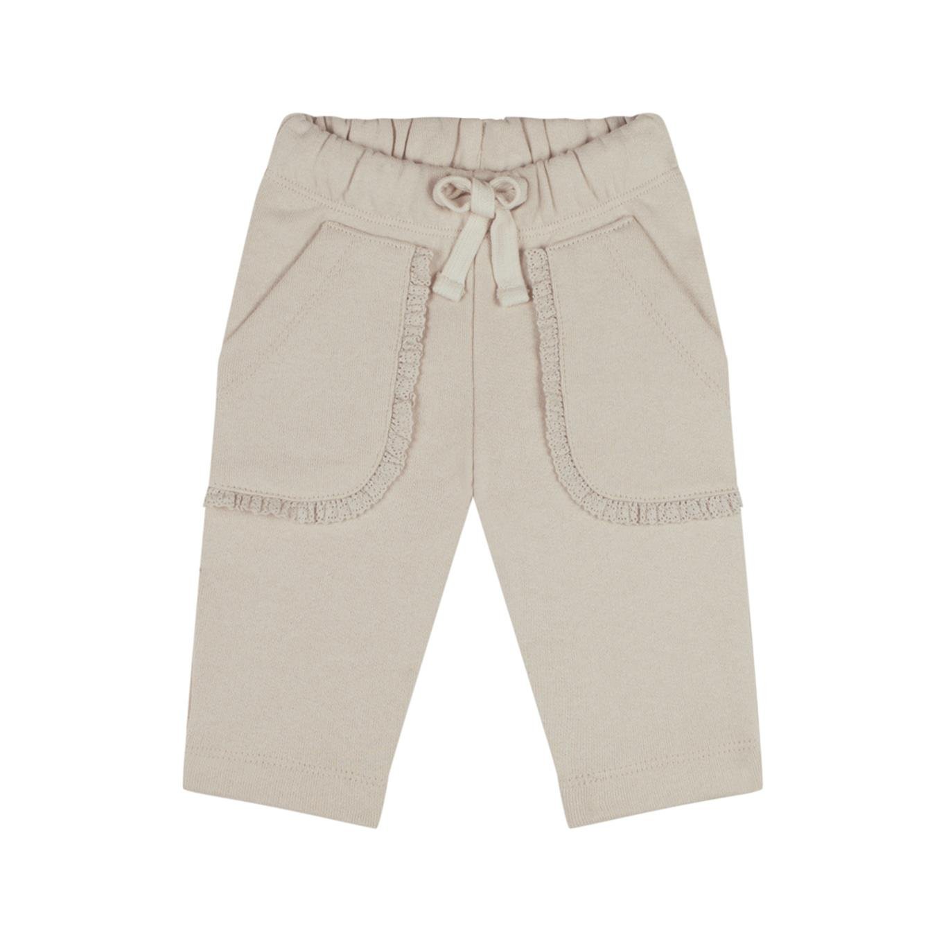 Elastik belli ve paçalı pantolonumuz, bebeğinizin beline göre ayarlanabilir şekilde kordonlu olarak tasarlanmıştır. Bebeğinizin güvenliğini sağlamak amacıyla kordonlar sabitlenerek dikilmiştir. Cep kısmında yer alan fırfır detayı ise tasarıma sevimli ve zarif bir dokunuş katmaktadır.