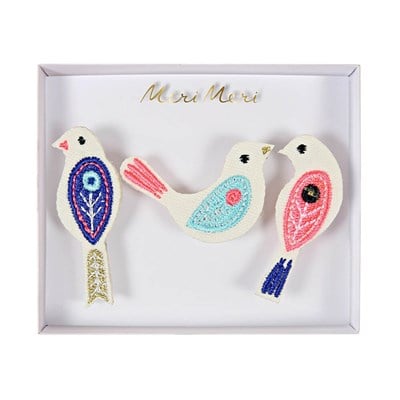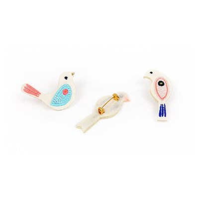 Çantanızdan mı sıkıldınız (veya palto veya şapka veya blazer veya…)? Yepyeni bir görünümde çok para harcamadan gardırobunuza yeni bir eğlence katmak mı istiyorsunuz? Altın tonlu iğnesi, doğal pamuklu kanvas ve keçeden yapılmış üç işlemeli broş paketi, ideal çözüm! Parlak renkler ve altın dikişler içeren bu güzel kuş broşlarıyla uçmaya hazırlanın.