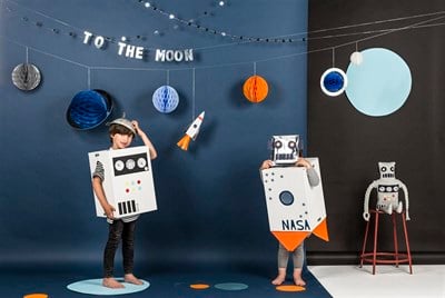 Pencerelerimizden dışarıya baktığımızda her gece görebiliyoruz, ama orada ne olduğunu kim bilebilir? Eğer ailenizin küçük üyesi parlak roketler, yepyeni gezegenler ve bilim kurgu tarzı maceraları hayal ediyorsa, 'To The Moon' parti koleksiyonumuza kesinlikle bakın. Galaktik parti alanınızı bu muhteşem "To the Moon" dekoruyla süsleyin. Küçük astronotlar etrafında toplanacaktır. Bu dekor, kağıt petek süsünden yapılan bir sürü 3D gezegene, bir roket ve parlak gümüş folyo ile süslenmiş çok sayıda yıldıza sahiptir.