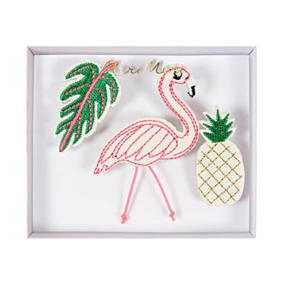 Çantanızdan mı sıkıldınız (veya palto veya şapka veya blazer veya…)? Yepyeni bir görünümde çok para harcamadan gardırobunuza yeni bir eğlence katmak mı istiyorsunuz? Altın tonlu iğnesi, doğal pamuklu kanvas ve keçeden yapılmış üç işlemeli broş paketi, ideal çözüm! Bu flamingo, ananas ve yaprak tasarımlarıyla tropikal stili hayatınıza katın ve tüm yıl boyunca tatil hissini yaşayın.