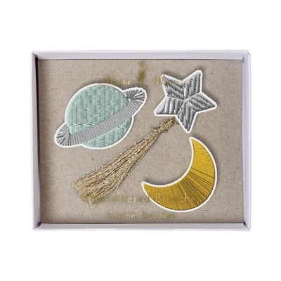 Çantanızdan mı sıkıldınız (veya palto veya şapka veya blazer veya…)? Yepyeni bir görünümde çok para harcamadan gardırobunuza yeni bir eğlence katmak mı istiyorsunuz? Altın tonlu iğnesi, doğal pamuklu kanvas ve keçeden yapılmış üç işlemeli broş paketi, ideal çözüm! Parıldayan altın kaplamalı bir ay, kayan bir yıldız ve gezegen uzay meraklılarının ilgisini çekecektir.